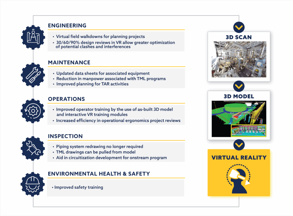 As part of the process, we first use laser scanning technology to capture existing conditions and create a fully intelligent 3D model. Scanning allows for the efficient and accurate gathering of field data and dimensions. Once this information is obtained, it is uploaded into the virtual world, and users can fully immerse themselves into the model without ever walking onsite. From there, we can identify equipment maintenance, create markups, and initiate virtual meetings with our clients from any location in the world.